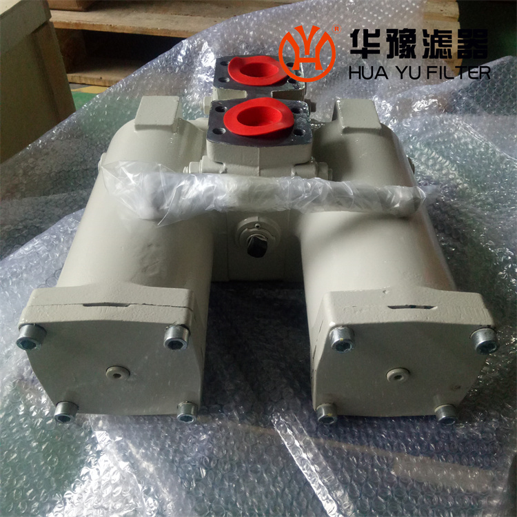 工作時(shí)一只濾筒通油,另一只濾筒不通油備用。當(dāng)工作濾筒的濾芯堵塞至壓差發(fā)訊器壓力指示值為0.5MPa時(shí),發(fā)訊器發(fā)訊,此時(shí)應(yīng)及時(shí)打開(kāi)壓力平衡閥、轉(zhuǎn)動(dòng)換向閥啟用備用濾筒(換向閥轉(zhuǎn)動(dòng)到位后關(guān)閉壓力平衡閥)。再只需旋開(kāi)螺塞放完被堵塞濾筒內(nèi)的油液,再旋下筒體,就可更換已堵塞的濾芯。如因故未能及時(shí)切換換向閥啟用備用濾筒,導(dǎo)致壓差持續(xù)上升至旁通閥開(kāi)啟壓力0.6MPa時(shí),旁通閥會(huì)自動(dòng)開(kāi)啟,以避免由于壓力繼續(xù)上升,濾芯破裂造成再污染。但此時(shí)油液未經(jīng)過(guò)濾對(duì)系統(tǒng)安全造成極大危害,應(yīng)盡可能避免旁通閥被開(kāi)啟。
